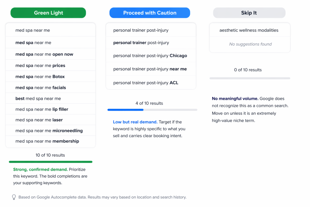 There are cases where we will move forward on a keyword that only partially autofills. If a term is highly specific to what our client sells and carries clear booking intent, even a small number of monthly searches can produce meaningful business value. A personal training studio that books one high-retention client per month from a low-volume keyword has still more than justified the page.
