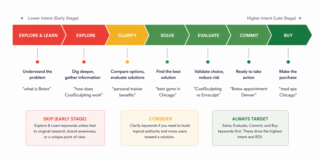 - Ready to Book: The searcher has made the decision and is looking for the right provider. They are not comparing options or doing research. They want to find someone, confirm they are credible, and schedule. Examples: “med spa near me,” “personal trainer Chicago,” “kitchen remodel contractor Denver.”