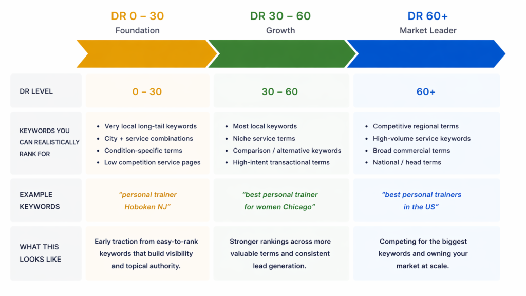 As a general benchmark for consumer and local businesses, a DR of 30 to 40 is enough to compete for most local and niche-specific keywords. In more competitive categories like cosmetic surgery, legal services, or financial products, you may need a DR of 60 or higher to reach page one for the primary terms.