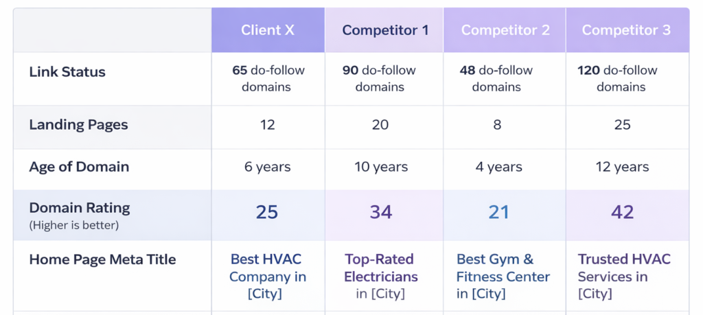 We analyze your top 2-3 competitors to identify: