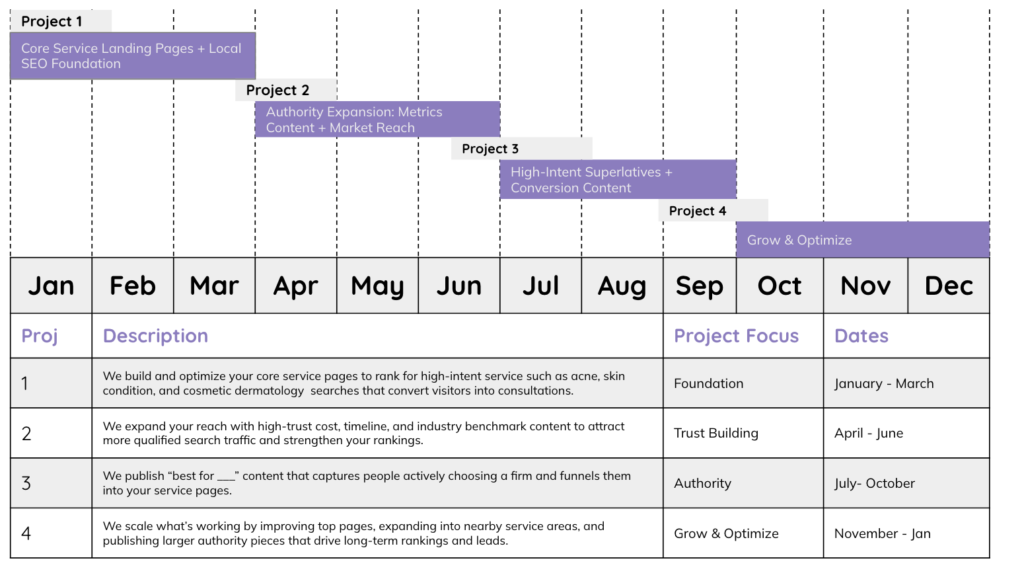 Get a data-driven SEO strategy that targets high-intent keywords, outmaneuvers competitors, and generates predictable organic growth. We analyze your market, identify opportunities, and build a month-by-month execution plan designed specifically for your business goals.