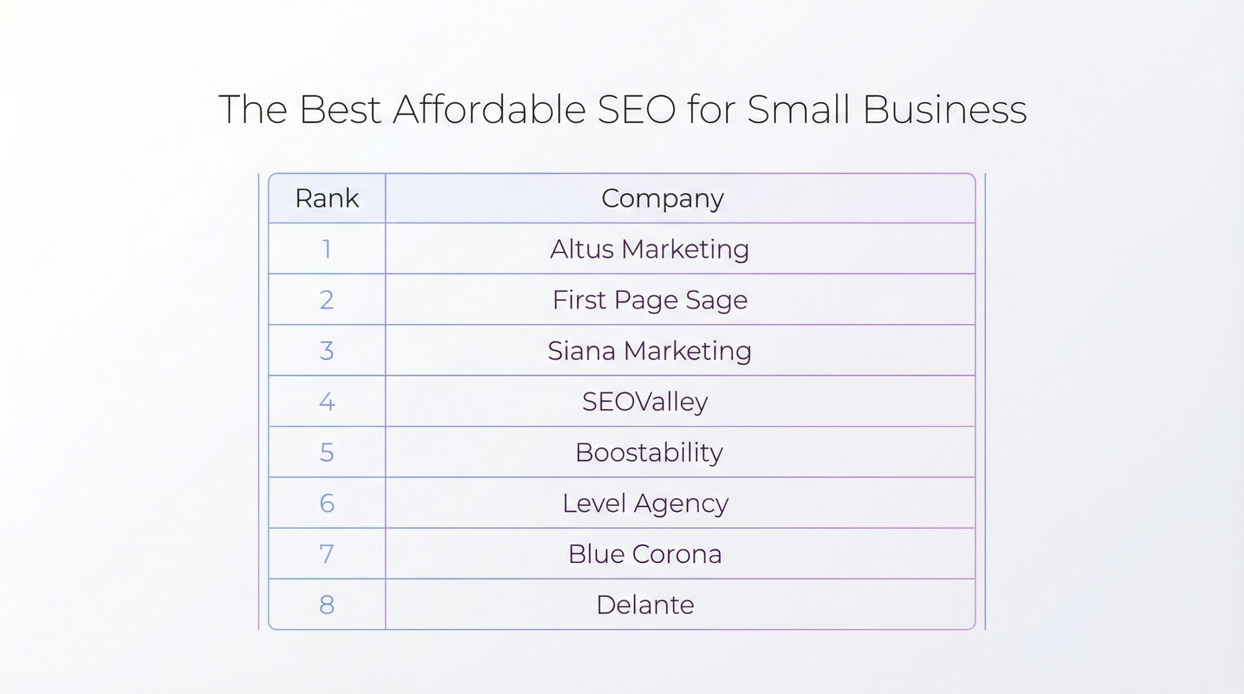 After ranking all 42 candidates, we identified the top 10 performers. The table below presents these leading SEO companies, followed by in-depth reviews of each agency.